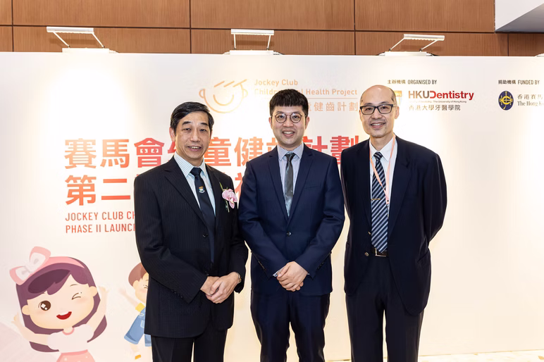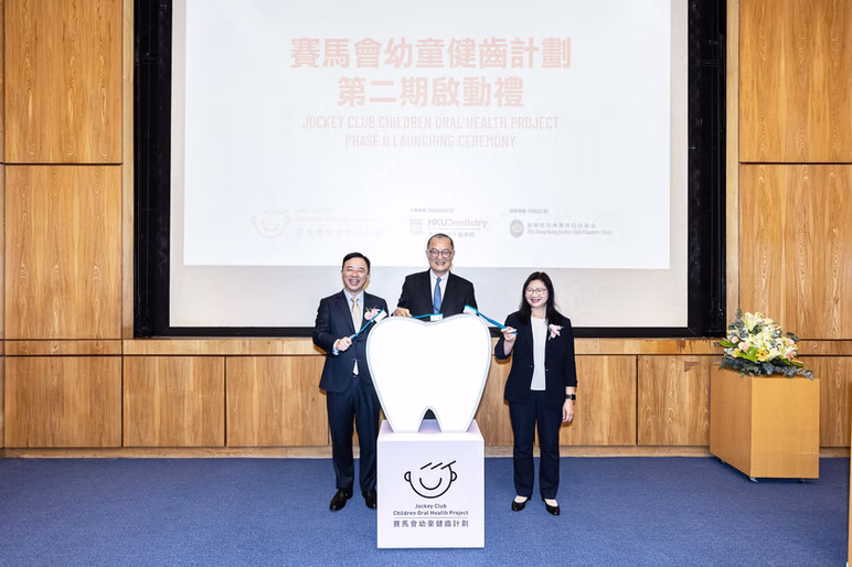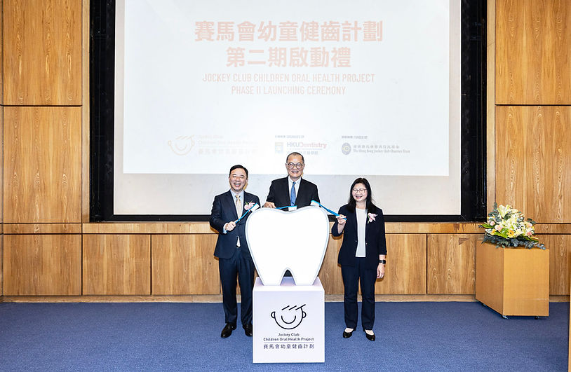 The "Jockey Club Children Oral Health Project" Phase II Launching Ceremony was held on July 23. The event was officiated by Professor Lo Chung-mau, Secretary for Health of the Hong Kong Special Administrative Region Government; Ms. Imelda Chan, Head of Charities (Healthy Community) of The Hong Kong Jockey Club; and Professor Zhang Xiang, President and Vice-Chancellor of The University of Hong Kong.